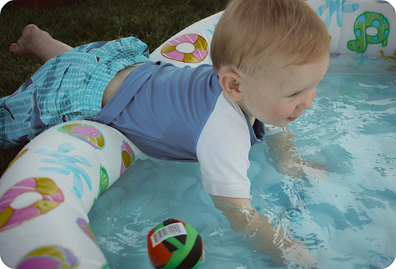 A couple of weeks ago, we celebrated Eli's first birthday with a small party. It was so hot that we decided to have a swim party. They are all so little, it was more of a wading pool/splashing party, but at least it helped keep everyone cool. Eli had a blast! He dived right into the wading pools with no fear, and kept himself busy running all around the sprinkler toys. I was glad he didn't get overwhelmed or cranky, which I've heard happens a lot with one year old parties.